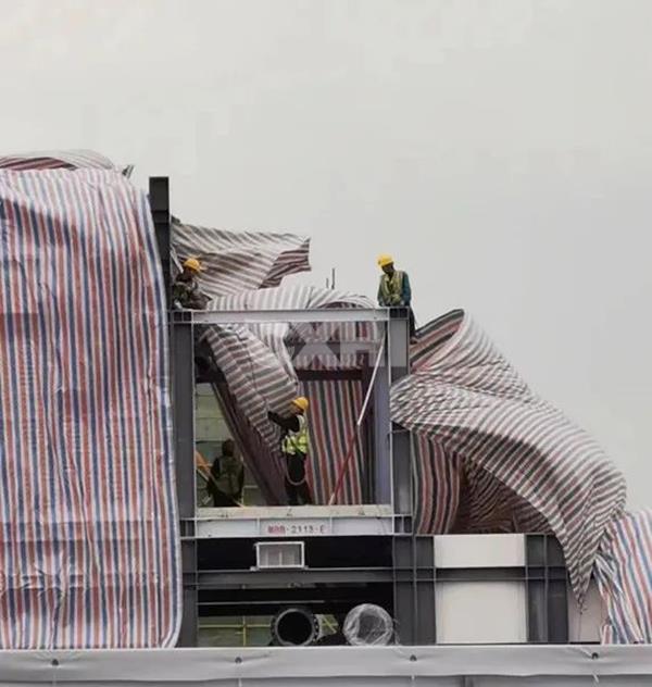 為保證工期,每一天都至關(guān)重要。正值春夏交替,臺風(fēng)及暴雨經(jīng)常光顧施工現(xiàn)場,項目團隊充分考慮到各種可能性,未雨綢繆及時準(zhǔn)備,避免雨水危害構(gòu)件防火層及機電設(shè)備。